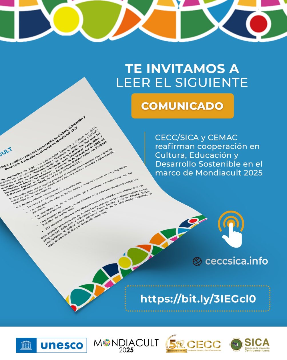 24 de septiembre de 2025 – La Coordinación Educativa y Cultural del SICA (CECC/SICA) y la Comunidad Económica y Monetaria de África Central (CEMAC) realizarán el side event: “Fortalecimiento de la cooperación Sur-Sur para las sinergias entre la cultura y la educación para sociedades sostenibles y resilientes en África y las Américas”, el próximo 30 de septiembre de 2025, en Barcelona, España, en el marco de la Conferencia Mundial sobre las Políticas Culturales (Mondiacult 2025), con el apoyo de la UNESCO.
